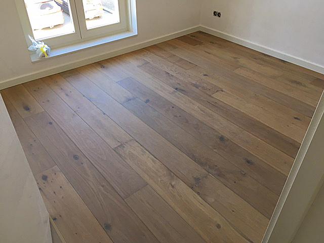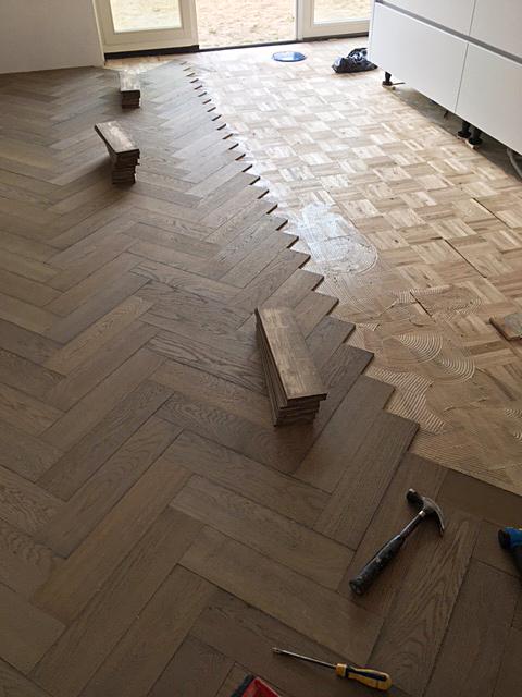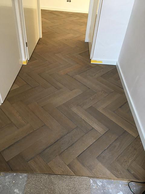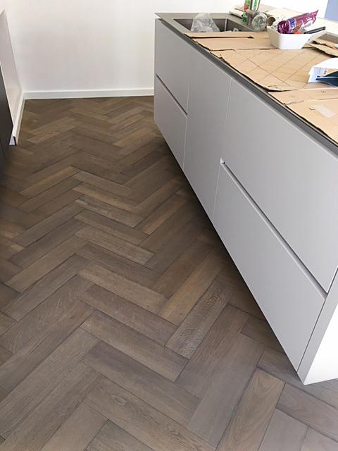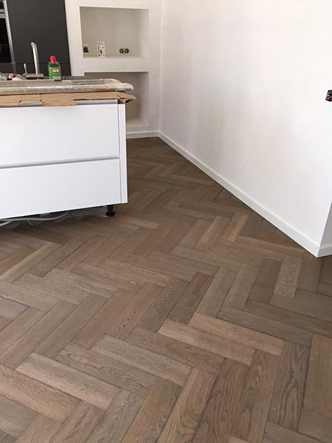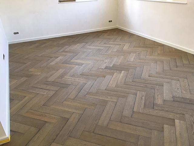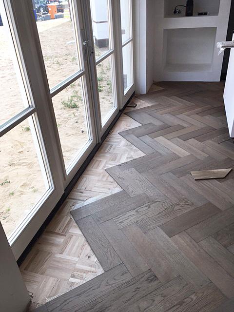 In deze fraaie woning legden wij zowel op de beneden- als op de bovenverdieping een fraaie parketvloer. Beneden werd een schitterende Grigio visgraat gelegd in de kleur Leisteen grijs, formaat 12 x 48 cm.